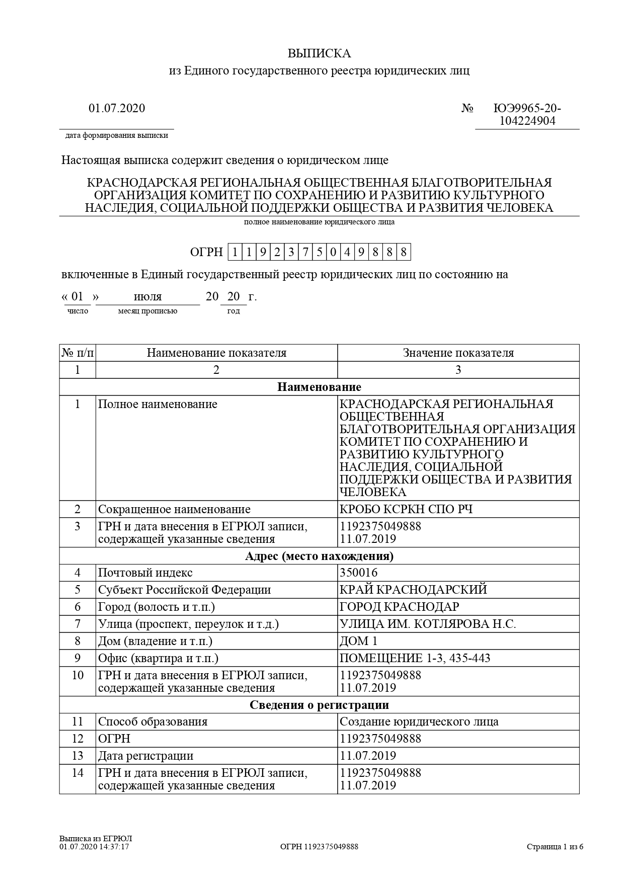 КРАСНОДАРСКАЯ РЕГИОНАЛЬНАЯ ОБЩЕСТВЕННАЯ БЛАГОТВОРИТЕЛЬНАЯ ОРГАНИЗАЦИЯ КОМИТЕТ ПО СОХРАНЕНИЮ И РАЗВИТИЮ КУЛЬТУРНОГО НАСЛЕДИЯ, СОЦИАЛЬНОЙ ПОДДЕРЖКИ ОБЩЕСТВА И РАЗВИТИЯ ЧЕЛОВЕКА